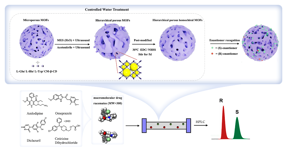 Homochiral metal-organic frameworks (HMOFs) have been reported as versatile platforms for chiral separation in recent years. However, achieving effective separation of chiral drugs with high molecular weights and intricate stereochemical configurations remains exceptionally rare, despite the significant application value and technical challenges associated with separating such drugs. Conventional MOFs are often constrained by their microporous structures, which restrict the diffusion and chiral recognition of bulky drug molecules. This limitation has spurred the interest in hierarchically porous MOFs (HPMOFs) as a novel research direction to address these challenges. In this study, the research group innovatively employed a high-intensity ultrasound-assisted controllable aqueous treatment strategy to precisely modulate the hydrolysis process of DUT-5-NH2. Meanwhile, via post-synthetic modification techniques, both chiral amino acids and carboxymethyl-β-cyclodextrin (CM-β-CD) were grafted onto the frameworks, enabling the successful construction of enantioselective hierarchically porous homochiral metal-organic frameworks (HPHMOFs). These multifunctional materials exhibit exceptional structural stability and recyclability while integrating three distinct resolution modalities: adsorption-based selectivity, solid-phase extraction, and chromatographic column separation. The HPHMOFs demonstrated robust chiral recognition capabilities for multiple drug enantiomers, underscoring their versatility and efficiency in addressing complex separation demands. Molecular dynamics simulations and quantum chemical calculations revealed that the chiral recognition process is governed by the synergistic host-guest interactions, including weak interactions like hydrogen bonding, van der Waals forces, steric effects, and the stereochemical selectivity imparted by grafted molecules. Notably, the spatial arrangement, bond multiplicity, and interaction strength of hydrogen bonds played a dominanct role in enantiomer separation performance. Theoretical calculations further clarified the molecular mechanism underlying the superior enantioselectivity of CM-β-CD-functionalized HMOFs exhibit the best enantioselective separation ability among the four types of HPHMOFs. It is particularly noteworthy that the differences in adsorption energy and interaction energy between HPHMOFs and drug enantiomers are in good agreement with their chiral separation abilities. This research successfully achieved the enantioselective separation of macromolecular chiral drugs (with a molecular weight exceeding 300 Da) by HPHMOFs for the first time, providing theoretical support and a methodological framework for expanding the application boundaries of chiral separation materials.