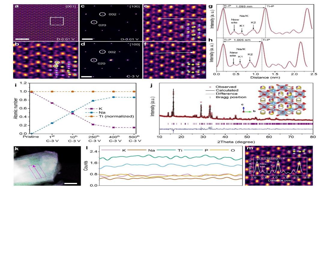 To this end, Professor Liu Jinping's team developed an interference-free KTiOPO4thin-film electrode model system. By integrating in-situ/operando spectroscopy, spherical aberration-corrected electron microscopy, and density functional theory calculations, they comprehensively unveiled the Na+storage mechanism. For the first time, both experimentally and theoretically, they demonstrated the incomplete K+/Na+exchange, the pillaring/stabilizing effect of 0.15 residual K+on the lattice tunnel structure, and the "near-zero strain" behavior (only 3.9%) of Na+intercalation and deintercalation in the material. They achieved long-cycle stability of over 10,000 cycles and excellent fast-charging safety (no sodium deposition at a 5C rate). At the same time, the prepared powder electrode exhibited a quite high capacity and was able to work efficiently at a commercial-grade areal capacity of 2.47 mAh cm−2. The assembled quasi-solid-state sodium-ion pouch cells still had high safety and long-cycle stability under extreme abuse conditions.